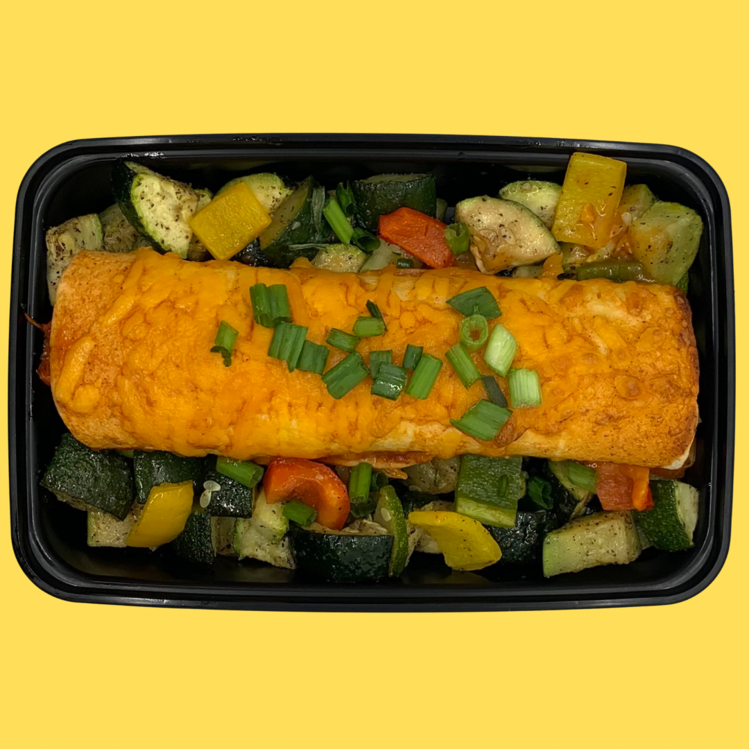 Savor our Beef Enchilada, featuring seasoned ground beef wrapped in a carb-balanced flour tortilla. It's layered with vibrant zucchini and peppers, smothered in rich red sauce, and topped with melted cheddar cheese for a satisfying and flavorful meal that delights every time.