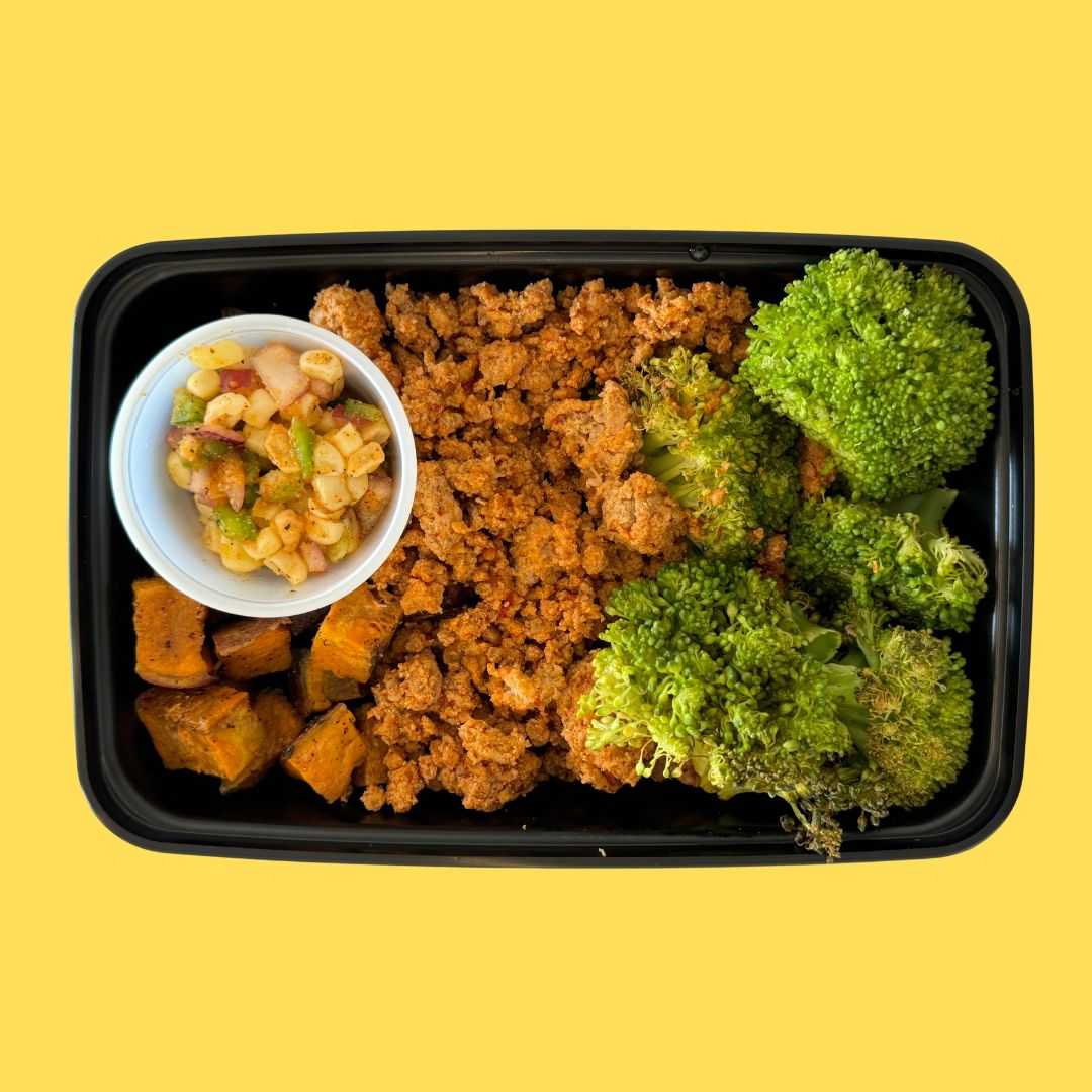 Savor the bold flavors of our Chipotle Turkey Bowl, featuring tender turkey seasoned with smoky chipotle spices. Paired with nutritious broccoli, roasted sweet potatoes, and a zesty Mexican corn relish, this bowl offers a satisfying balance of protein, fiber, and vibrant taste. Perfect for a wholesome meal that fuels your day with delicious, wholesome ingredients.